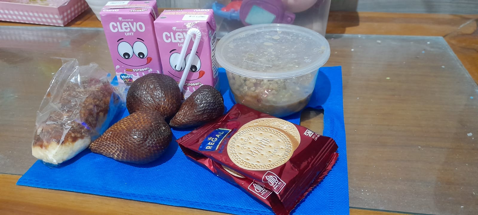 Berdasarkan pantauan di lapangan, setiap siswa menerima satu kantong berisi satu porsi bubur kacang hijau, satu bungkus roti, dua bungkus roti Marie Regal ukuran rentengan, dua kotak susu rasa stroberi, serta tiga buah salak—dengan rincian satu buah per hari.