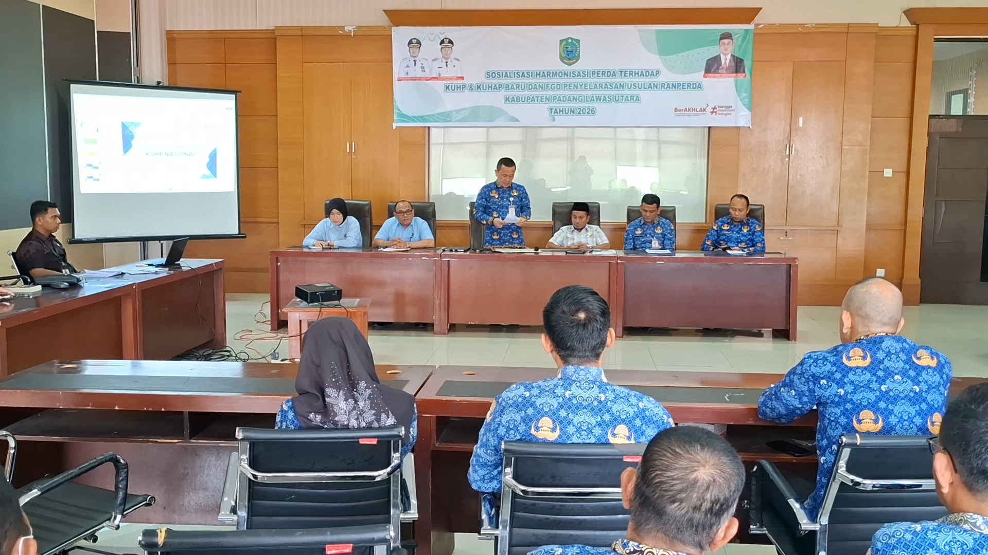 PALUTA || Pemerintah Kabupaten Padang Lawas Utara (Paluta) menggelar kegiatan Sosialisasi dan Focus Group Discussion (FGD) Harmonisasi Peraturan Daerah terhadap Kitab Undang-Undang Hukum Pidana (KUHP) dan Kitab Undang-Undang Hukum Acara Pidana (KUHAP) yang baru, sekaligus penyelarasan Rancangan Peraturan Daerah (Ranperda) Kabupaten Padang Lawas Utara Tahun 2026. Kamis (12/03/2026).