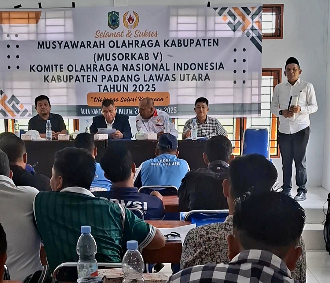 Padang Lawas Utara — Komite Olahraga Nasional Indonesia (KONI) Kabupaten Padang Lawas Utara (Paluta) menggelar Musyawarah Olahraga Kabupaten (Musorkab) ke-V di Aula Kantor KONI Paluta, Jumat (26/12/2025). Agenda utama Musorkab ini adalah pemilihan Ketua Umum KONI Paluta untuk masa bakti 2025–2029.