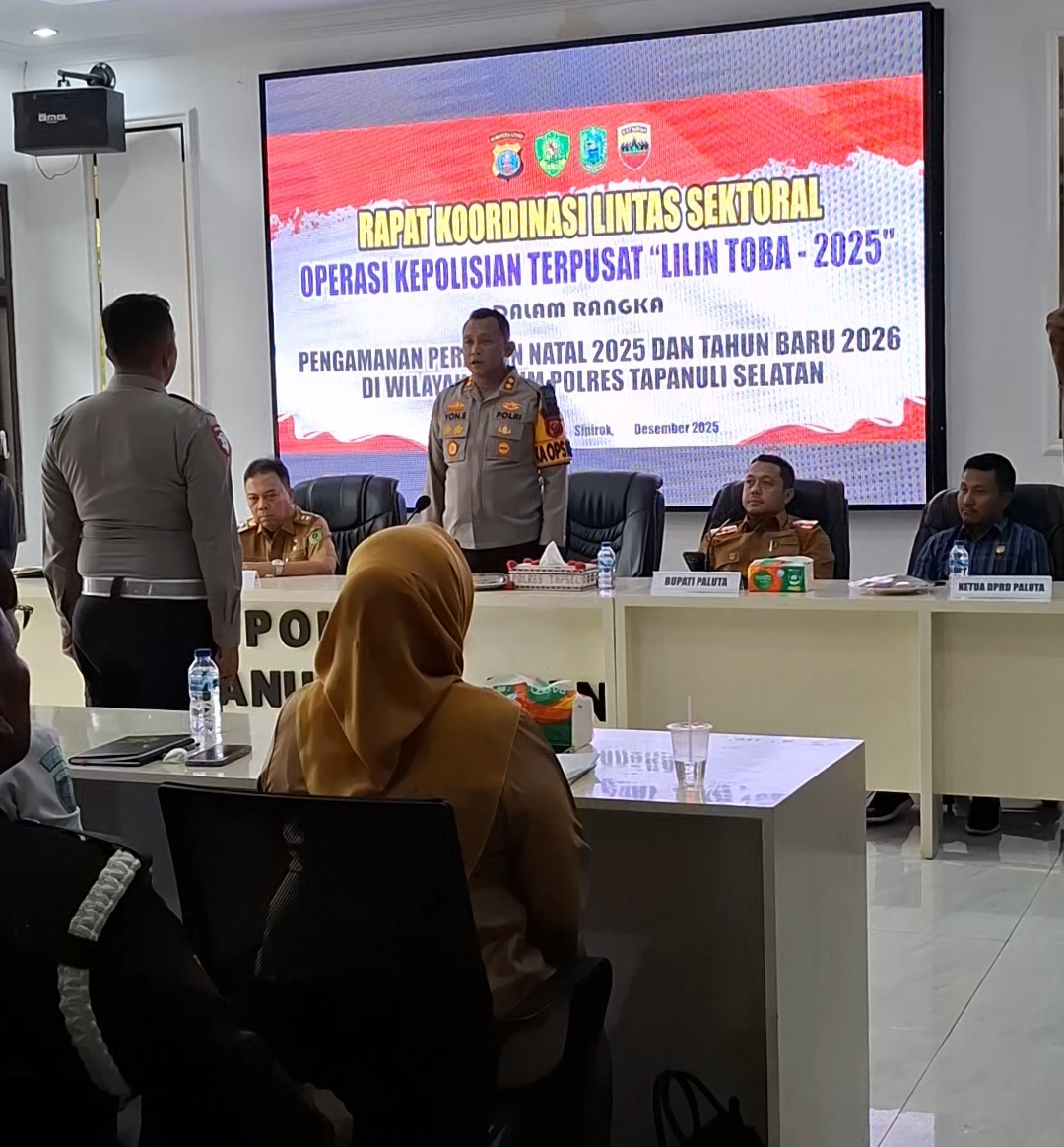 Rakor tersebut dilaksanakan di Aula Lantai II Mapolres Tapanuli Selatan (Tapsel), selasa (16/12/2025) dan dihadiri langsung Kapolres Tapsel AKBP Yon Edi Winara, S.H., S.I.K., M.H., Bupati Padang Lawas Utara Reski Basyah Harahap, S.STP., M.Si., Wakil Bupati Tapsel H. Jafar Syahbuddin Ritonga, MBA, DBA, serta unsur Forum Koordinasi Pimpinan Daerah (Forkopimda) Kabupaten Tapsel dan Paluta.