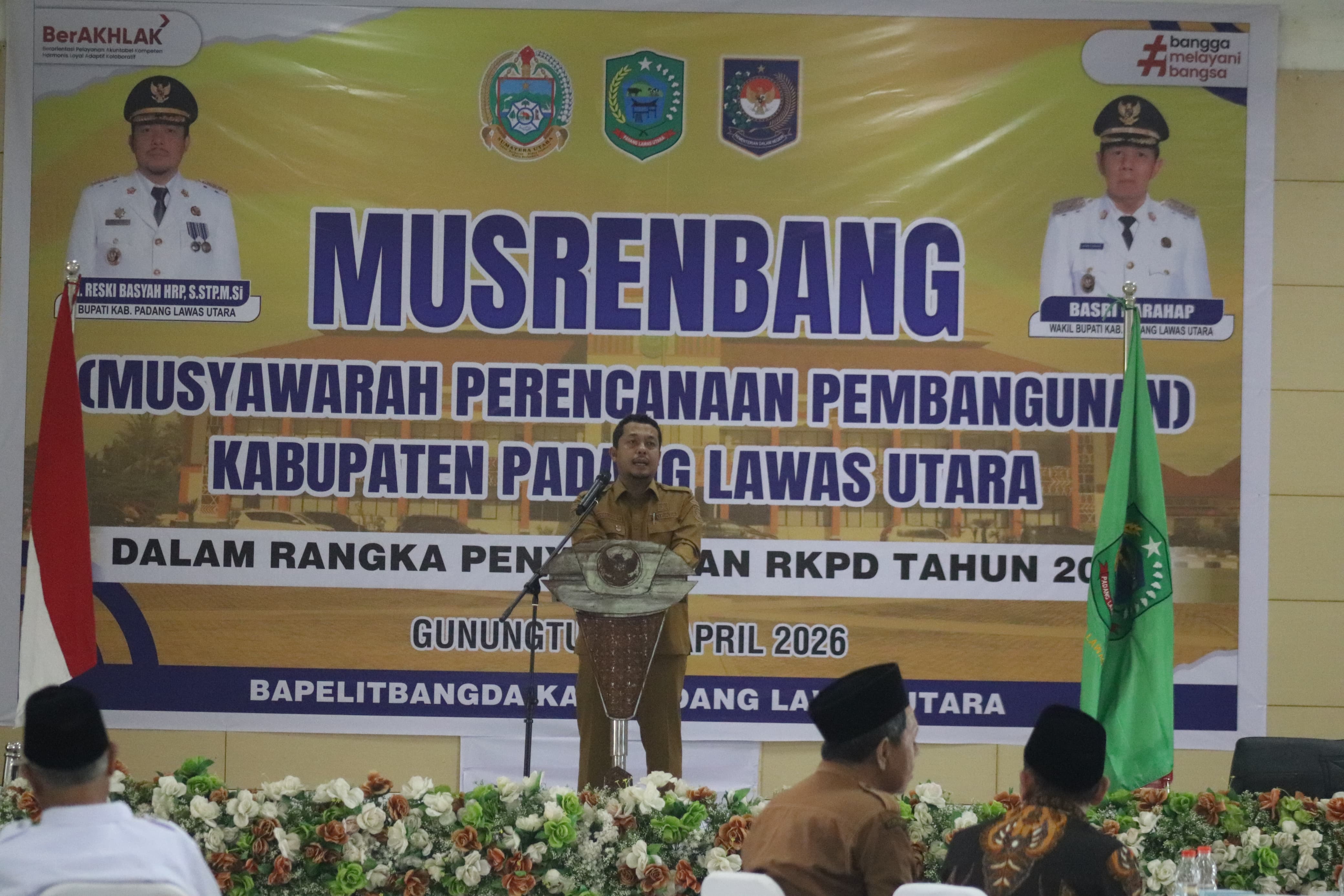 PALUTA || Bupati Padang Lawas Utara (Paluta), Reski Basyah Harahap, secara resmi membuka acara Musyawarah Perencanaan Pembangunan (Musrenbang) Rencana Kerja Pemerintah Daerah (RKPD) Kabupaten Padang Lawas Utara Tahun 2027 di Gedung Serbaguna Kantor Bupati Paluta, Senin (14/4/2025).
