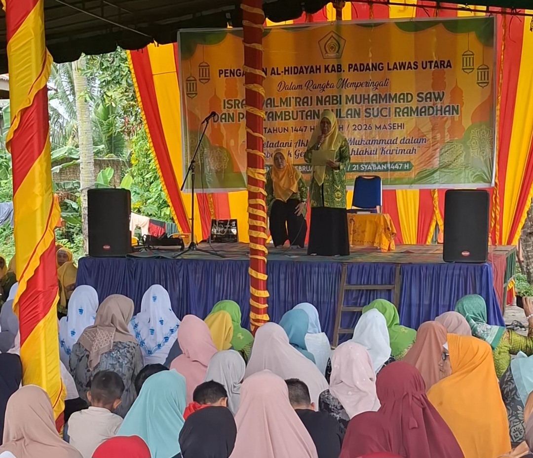 PADANG LAWAS UTARA – Suasana religius dan penuh kekhusyukan menyelimuti Halaman Kantor DPD Partai Golkar Kabupaten Padang Lawas Utara, Kampung Banjir, Senin (9/02/2026). Pengajian Al Hidayah Kabupaten Padang Lawas Utara (Paluta) menggelar peringatan Isra Mi’raj Nabi Muhammad SAW sekaligus penyambutan Bulan Suci Ramadhan 1447 Hijriah.